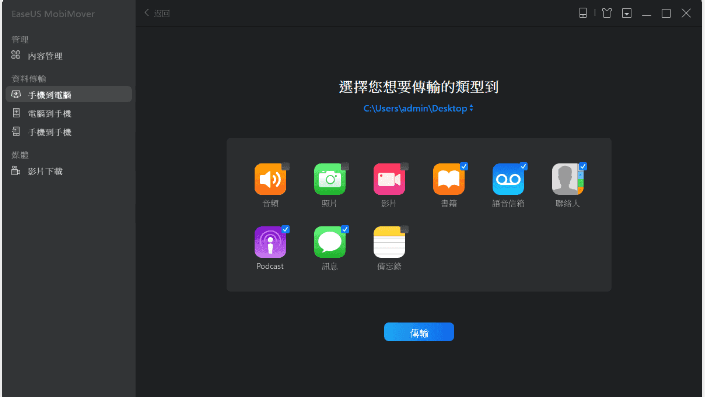 步骤 2. 易我手机数据传输支持将手机上的音频、视频、图片、联络人、电子书、信息传输到计算机。在这里,只选择「图片」。默认情况下,易我手机数据传输会将文件储存在桌面;或者,您可以根据个人需求自定义储存路径。