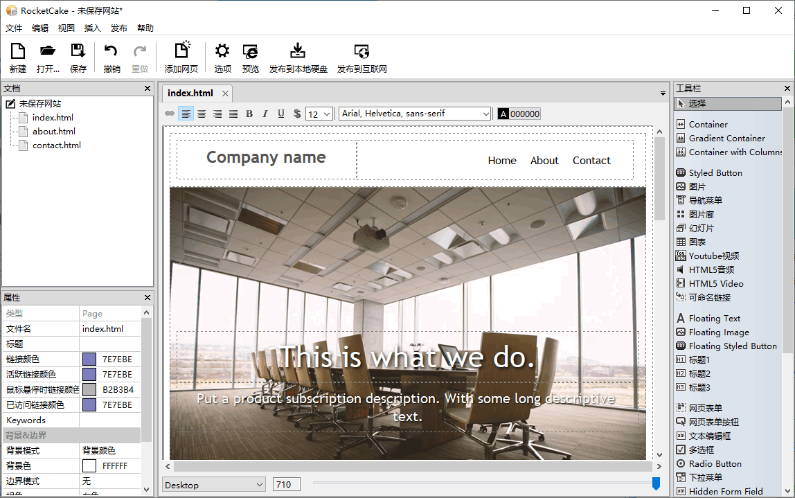 RocketCake是一款免费的响应式网站创建工具,该软件为初学网页设计的用户提供了一个简单易用的网页开发环境,用户通过单击和拖放就可以构建网页中需要的各种元素,即使用户不会设计网页界面,也可以直接套用软件中提供的各种风格类型的网页模板;使用RocketCake用户可以开发出适合电脑或者手机等设备浏览的响应式网站,与其它的网页设计软件一样,这款软件同样遵从所见即所得的设计原则,在电脑中设计的网页效果就是在网站中正式打开显示的效果;需要的朋友欢迎在本站下载使用。