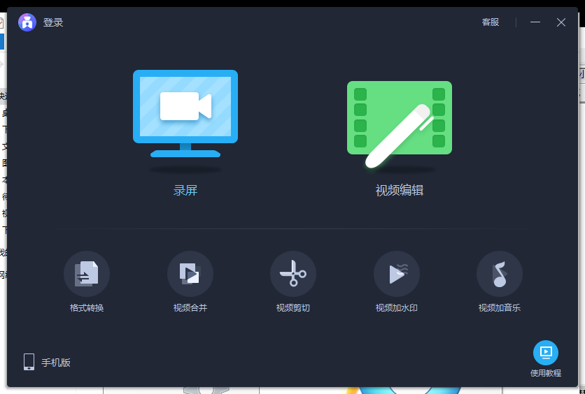 1、双击软件进入软件操作页面 ,该页面可以进行录屏、视频编辑、格式转换、视频合并、视频裁剪和视频夹水印等操作