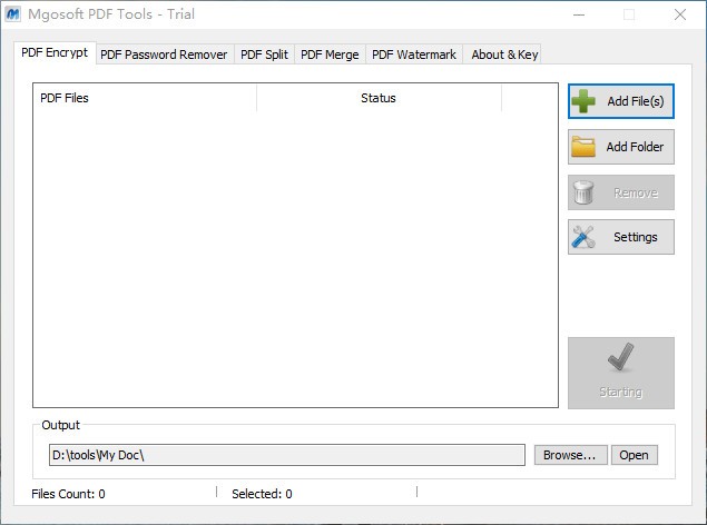 Tools是一款非常专业且优秀的PDF工具箱,可帮助用户快速对PDF文件进行一系列的操作,将其进行处理,软件功能丰富,应有尽有,总有您需要使用的功能,软件上方并排显示所有功能,便于用户快速进行选择,如PDF加密,操作也非常简单,可添加单个PDF文件,将某一重要文件单独进行处理,也可添加文件夹,将文件夹中的所有文件全部进行处理,添加文件后,进行简单设置,设置好输出目录,一键即可进行处理,快速且高效的输出处理后的文件,欢迎有需要的用户下载体验
