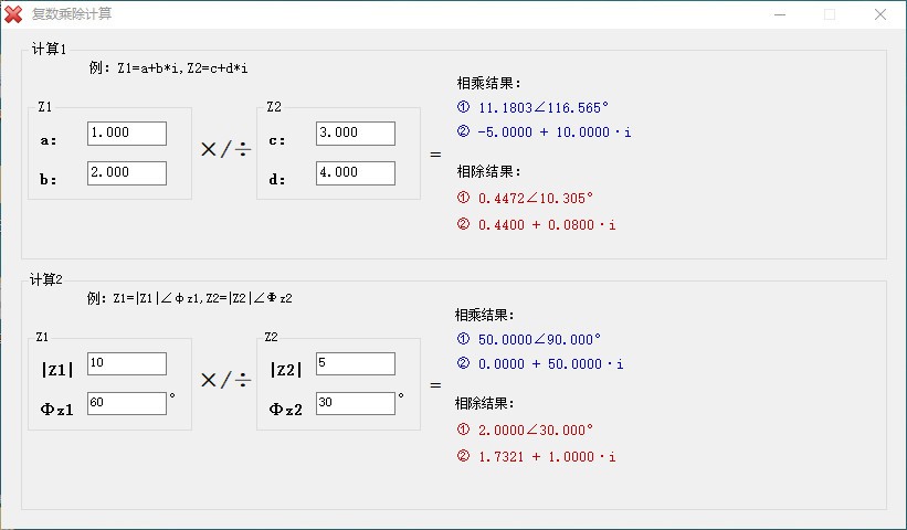 复数乘除计算器是一款非常简单且使用的复数计算工具,可帮助用户快速进行复数乘除计算,与大多计算器一样,操作都很简单,只需输入相关数据即可进行计算,这款软件也是如此,提供计算示例,可了解具体的参数,只需输入相关参数对应的数据,一键即可进行计算,通过强大的计算功能,快速且准确的显示出相乘结果和相除结果,软件结构清晰明了,计算结果全都集中显示,便于快速查看计算结果,总而言之,这是一款非常好用的软件,如果您有需要,那就赶快下载体验一下吧!