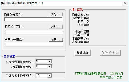 测量坐标检查统计工具是一款非常简单且实用的坐标测量工具,可帮助用户快速测量坐标,还可对坐标进行检查统计,具备简洁直观的操作界面,旨在为用户提供最简单的操作,只需选择原始坐标文件和检查坐标文件,设置好结果保存位置,输入相应的参数,一键即可进行统计计算,快速且准确的输出计算结果,可直接查看每个参数所对应的计算结果,还可将统计结果保存在指定位置,便于下次使用,总而言之这是一款非常好用的软件,如果您有需要,那就赶快下载体验一下吧!