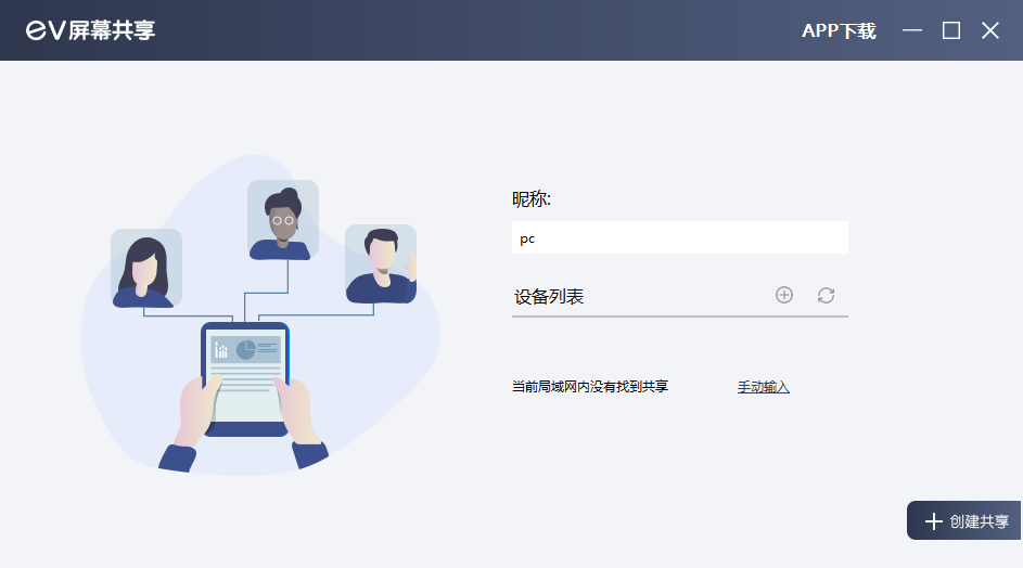 1、双击软件进入屏幕共享页面,该页面可以设置用户昵称和添加设备列表