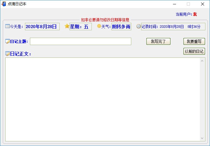 点滴日记本是一款非常简单且实用的日记本软件,可帮助用户快速编辑日记内容,很多人都有写日记的习惯,以往都是用日记本写日记,但是这样很容易被别人看见,也不怎们安全,小编推荐的这款软件,可在电脑上写日记,并需要密码登录才可进入软件,查看日记内容,可将生活中的点点滴滴记录下来,永久保存在电脑上,软件界面简洁直观,使得操作也很简单,自动显示日期、时间以及天气情况,支持查询功能,只需输入详细的日期即可快速进行查询,这么好用的软件,赶快下载试试吧!