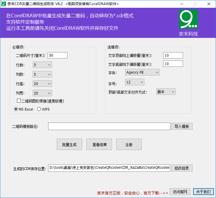 奈末CDR矢量二维码生成助手是一款功能强大、专业实用的生成矢量二维码软件,该软件支持二维码矢量生成,通过该软件用户可以进行二维码尺寸、行数、列数、行高、列宽等各项参数进行自定义设置,可以让用户灵活设计并生成二维码;奈末CDR矢量二维码生成助手支持二维码图形焊接、支持二维码文本内容自定义编辑、二维码一键批量生成等多种功能,让用户可以设计生成二维码更轻松、更方便;奈末CDR矢量二维码生成助手界面简洁、操作简单且方便实用,是一款可以在CorelDRAW中批量生成矢量二维码的强大软件,非常值得大家下载进行使用。