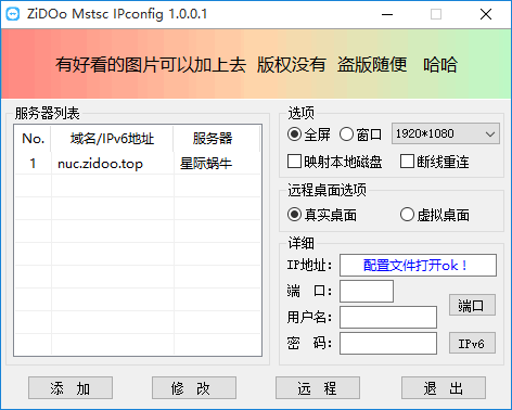 ZiDOo mstsc IPconfig是一款远程的计算机桌面款里软件,通过这款软件能够轻松的对其它计算机进行监控,并且在此过程中只需要消耗很少的网速;目前移动宽带已经向公众提供ipv6的网络,这使得微软的远程桌面变得更加的实用速度也快乐不少,这也使得不少用户选择抛弃TeamViewer和anydesk;软件的管理功能比较强大,实用一台计算机就可以轻松管理并监控多台计算机,并且耗费的网速是很少的,即使实用4G网速也能够轻松且流畅的远程观看视频,感兴趣的朋友欢迎下载。