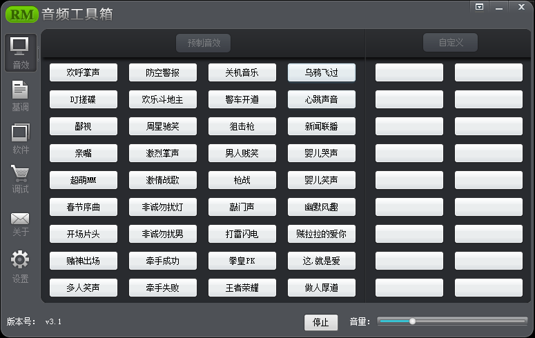 RM音频工具箱是一款功能强大、专业好用的音效播放软件,该软件支持音效预制、音效基调搜索等多种功能,能够帮助用户实现御姐、萝莉、少女、男音等多种音效变音,同时可以通过该软件进行音效变音进行基调设置,非常适合主播进行使用;RM音频工具箱是一款多功能的主播音效软件,通过该软件用户能够快速的设置音效快捷键,从而根据直播间的情况快速进行热场等操作;RM音频工具箱支持用户自定义音效和自定义快捷键功能,非常方便实用,感兴趣的用户赶快下载试试吧。