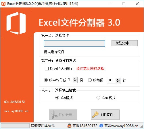 Excel文件分割器是一款非常简单且实用的Excel文件分割软件,可帮助用户快速将Excel文件进行分割,具备简洁直观的操作界面,旨在为用户提供一套最简单的Excel文件分割方案,只需选择Excel文件,选择分割方式,然后选择输出格式,一键即可开始分割,快速且准确的输出分割后的文件,提供向导式界面,并且将每个操作步骤前进行了标号,直接了解正确的操作顺序,即便您是新手,也能根据所给提示一步一步完成相关操作,实现Excel文件分割,这么好用的软件,赶快下载试试吧!