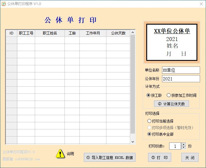 公休单打印程序是一款非常专业且优秀的公休单打印软件,可帮助用户快速将公休单进行打印,具备简洁直观的操作界面,旨在为用户提供最简单的操作,只需导入职工信息Excel数据,计算公休天数,选择需要打印的内容,通过几个简单的步骤一键即可进行打印,快速且高效的打印出公休单,使用起来非常方便,提供向导式界面,将每个操作前都进行了编号,直接查看操作顺序,即便您是新手,也能按照相关提示一步一步进行相应的操作,实现打印功能,这么好用的软件,赶快下载试试吧!