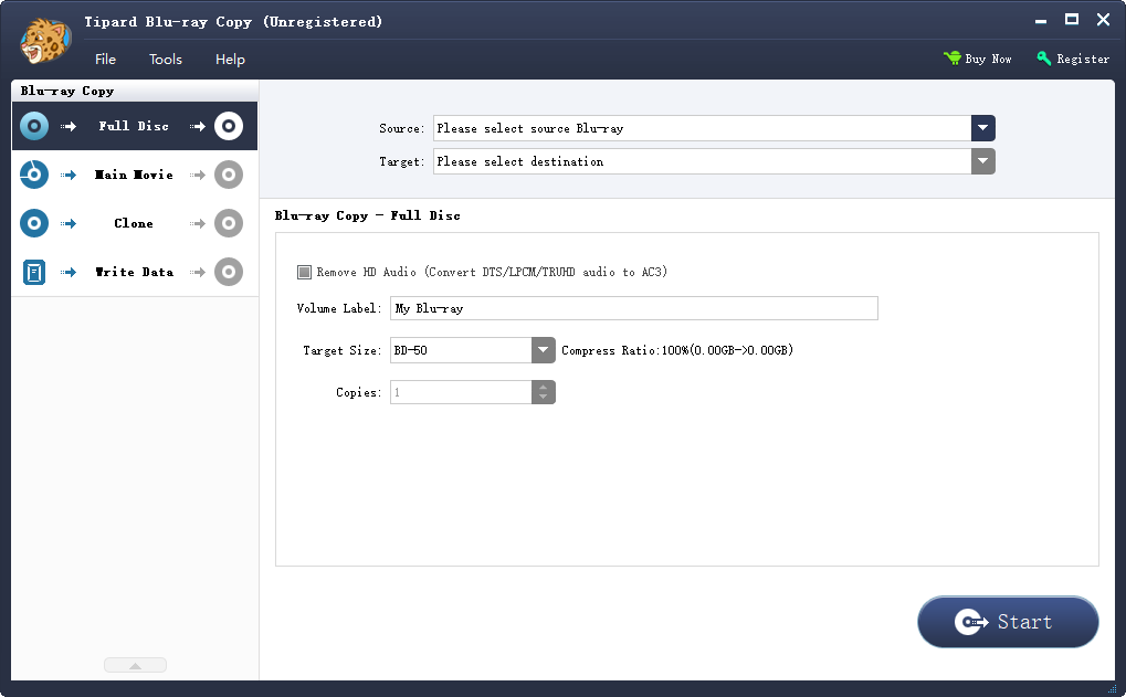 为了帮助需要节省硬盘空间或使用较少空间来存储对播放质量没有影响的备份的用户,此蓝光复制软件为您提供了删除高清音频的选项,该选项将转换高清音频(杜比TrueHD和DTS-HD Master Audio)连接到杜比AC3。蓝光克隆软件可满足用户的不同需求,它不仅设计有四种模式,而且还在“主要动作”部分提供内置播放器,仅用于您正确选择需要复制的主要电影,章节或标题。它的功能还在于点击按钮,引导用户仅单击“下一步”或“开始”即可继续执行每个步骤。没有多余的修改,没有多余的文字描述或操作,这款Blu-ray Copy软件无疑被视为复制Blu-ray的最佳软件。