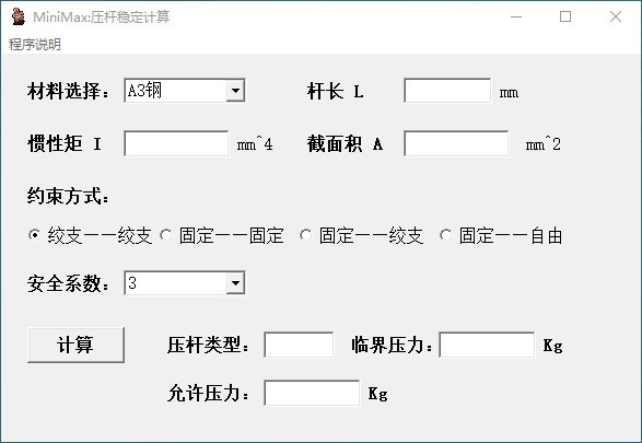 货架立柱承载承重计算是一款非常简单且实用的货架杆承重力计算工具,可帮助用户快速将货架杆承重力进行计算,当您需要用货架存放物品时,不知道货架能够承受多大的重力,即存放多少物品,这时候就可以用到这款软件,通过此软件快速计算出货架杆的承重力,即可直接了解该货架能够承受的重力,操作非常简单,只需选择材料,输入相关必要的数据,选择约束方式和安全系数,一键即可进行计算,快速且准确的输出计算结果,可直接复制进行使用,欢迎有需要的用户下载体验