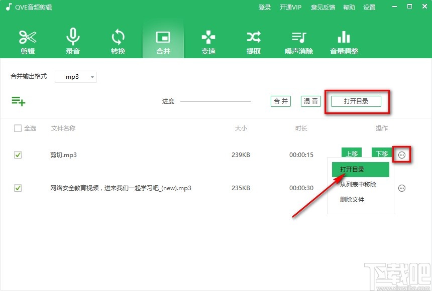 6.等到音频文件合并完成之后,我们可以点击界面中的打开目录按钮查看文件,也可以点击最右边的三点按钮选择打开目录选项准备查看文件。