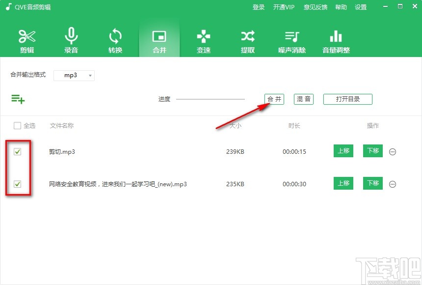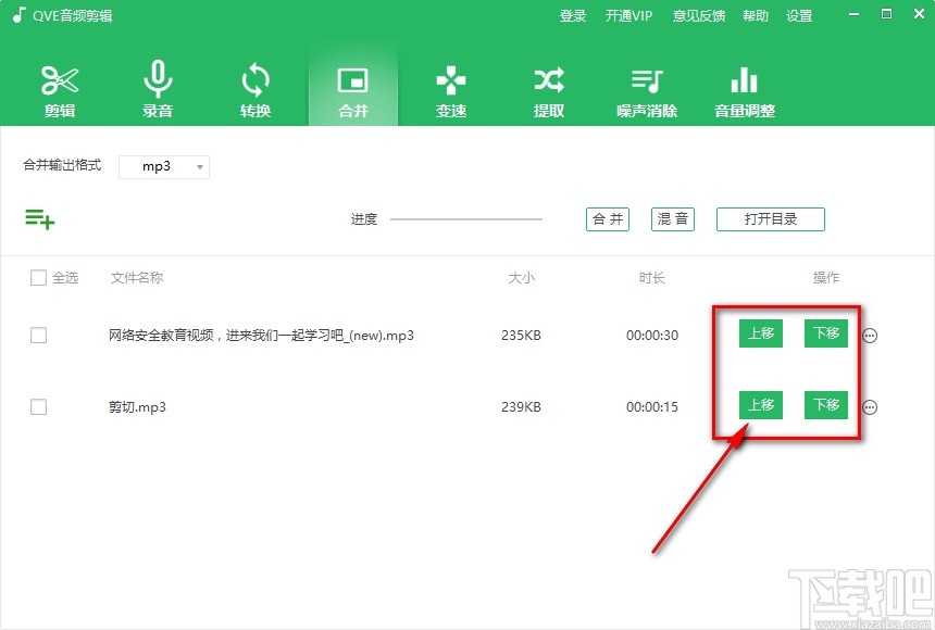 3.点击这个打开按钮之后,我们在软件界面就可以看到成功添加进来的音频文件,然后我们点击右下角的上移、下移按钮可以调整合并的顺序。