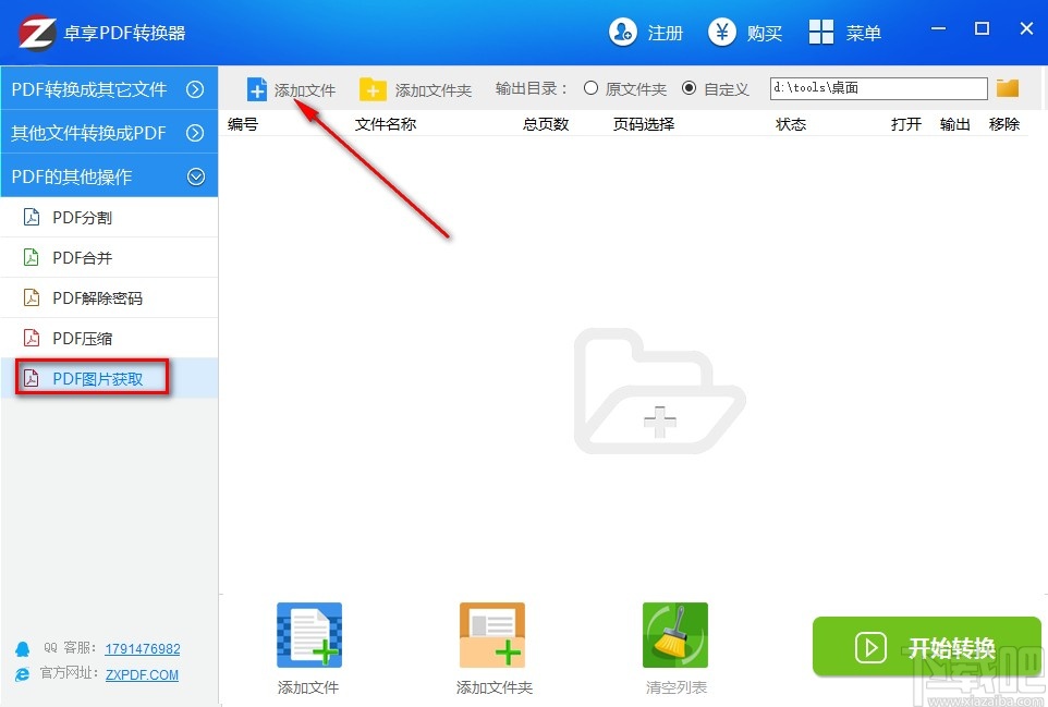 1.首先第一步我们打开软件之后,在软件界面左边选择PDF图片获取这个功能选项,然后点击上方的添加文件按钮。