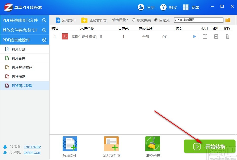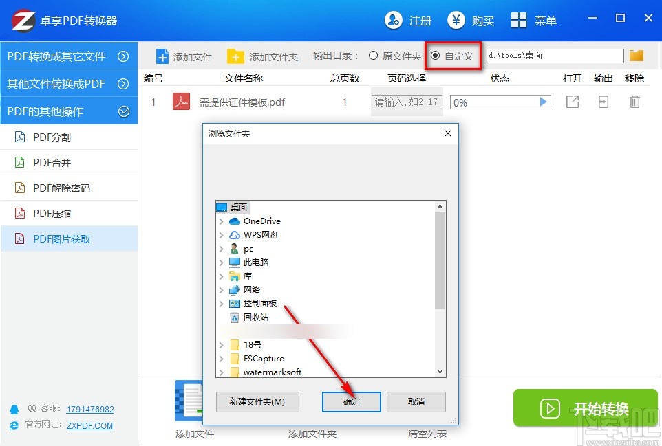 4.点击确定按钮之后我们就设置好输出目录了,然后我们点击界面右下角的开始转换按钮即可开始提取PDF文件图片的操作。
