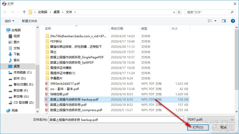 2.点击这个添加文件按钮之后,在出现的选择文件界面我们就可以选择想要处理的PDF文件了,选中之后点击打开按钮。