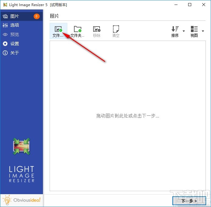 1.首先第一步我们打开软件之后在软件界面左上方点击文件添加图标,点击之后准备添加想要处理的图片文件。