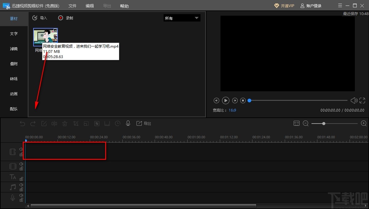 3.点击这个打开按钮之后,下一步我们在界面中找到想要编辑处理的视频,选中之后拖拽到下方的时间轴上面。