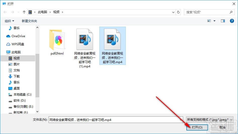 2.点击导入文件之后,下一步会的打开一个选择文件的界面,我们在界面中选中想要处理的视频文件之后点击打开按钮。
