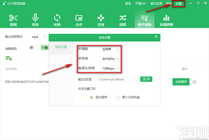 6.然后在界面右上角找到“设置”按钮,点击该按钮会有一个设置窗口出现在桌面上,分别点击窗口中的声道数、采样率、音频比特率三个选项后面的下拉框,并根据自己的需要在下拉框中对这几个参数进行设置。
