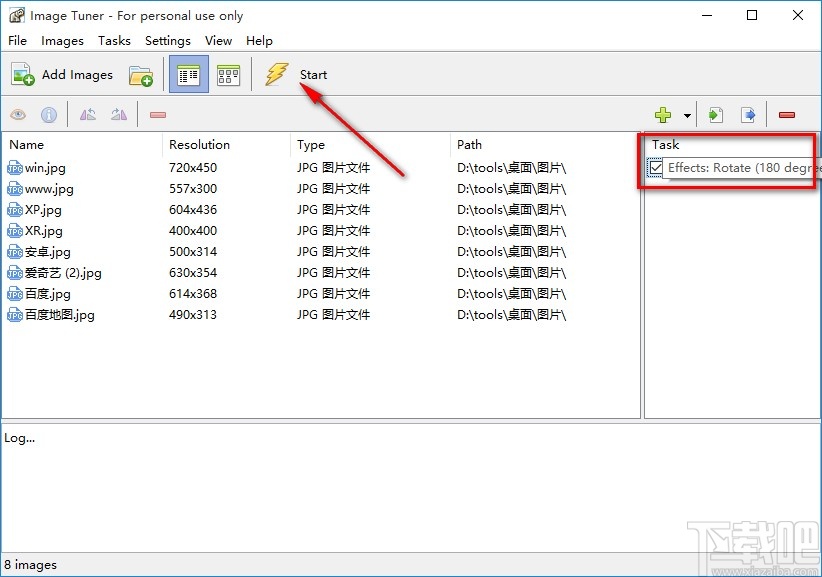 5.点击OK按钮就成功设置好旋转图片任务了,在主界面右边可以看到旋转任务,最后我们点击软件界面上方的这个Start按钮就可以开始批量旋转这些图片了。