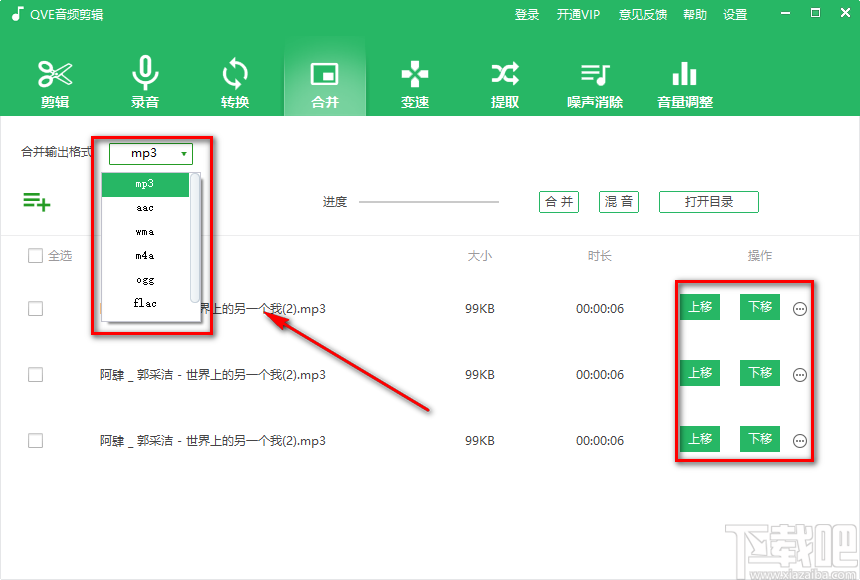 4.将音频文件添加到软件后,我们可以在界面右侧找到“上移”、“下移”按钮调整音频合并的顺序;也可以在页面左上方找到“合并输出格式”选项,点击该选项的下拉框,并根据需要在下拉框中选择音频格式。