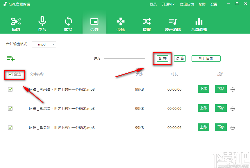 7.最后,我们在界面左侧找到“全选”选项,点击该按钮使其前面的小方框打钩,然后再点击页面右上方的“合并”按钮就可以合并音频,并将合并后的音频文件保存到指定的文件夹中。