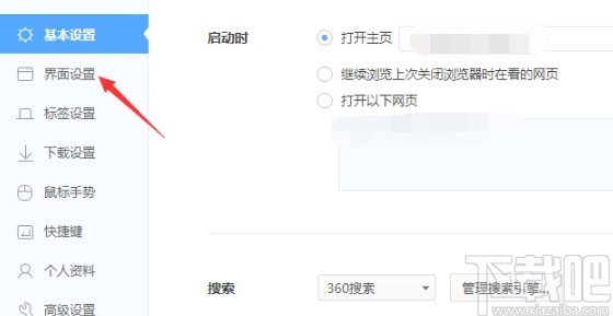 2.点击选项进入到浏览器的选项设置界面之后,我们在其中点击左边设置选项列表的界面设置功能,切换到界面设置中。