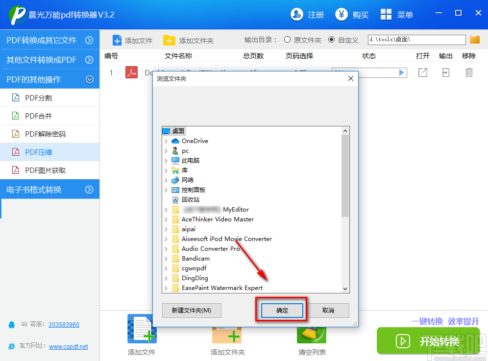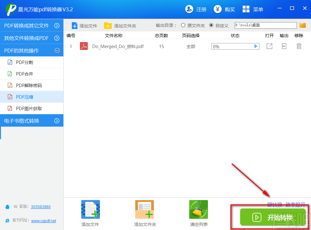 6.完成以上所有步骤后,我们在界面右下角找到绿色的“开始转换”按钮,点击该按钮就可以开始压缩PDF文件并将其保存在指定的文件夹中。