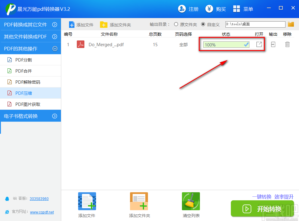 7.PDF压缩的速度非常快,压缩完成后,我们可以在界面上的文件列表中查看到压缩状态是100%。还可以点击打开一栏下方的文件打开按钮将文件打开并进行查看。