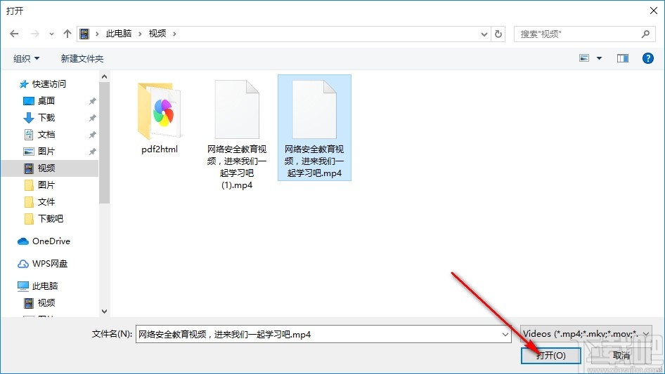 2.点击添加文件按钮之后,我们在出现的选择文件界面中,点击界面右下角的打开按钮即可选择这个视频文件。