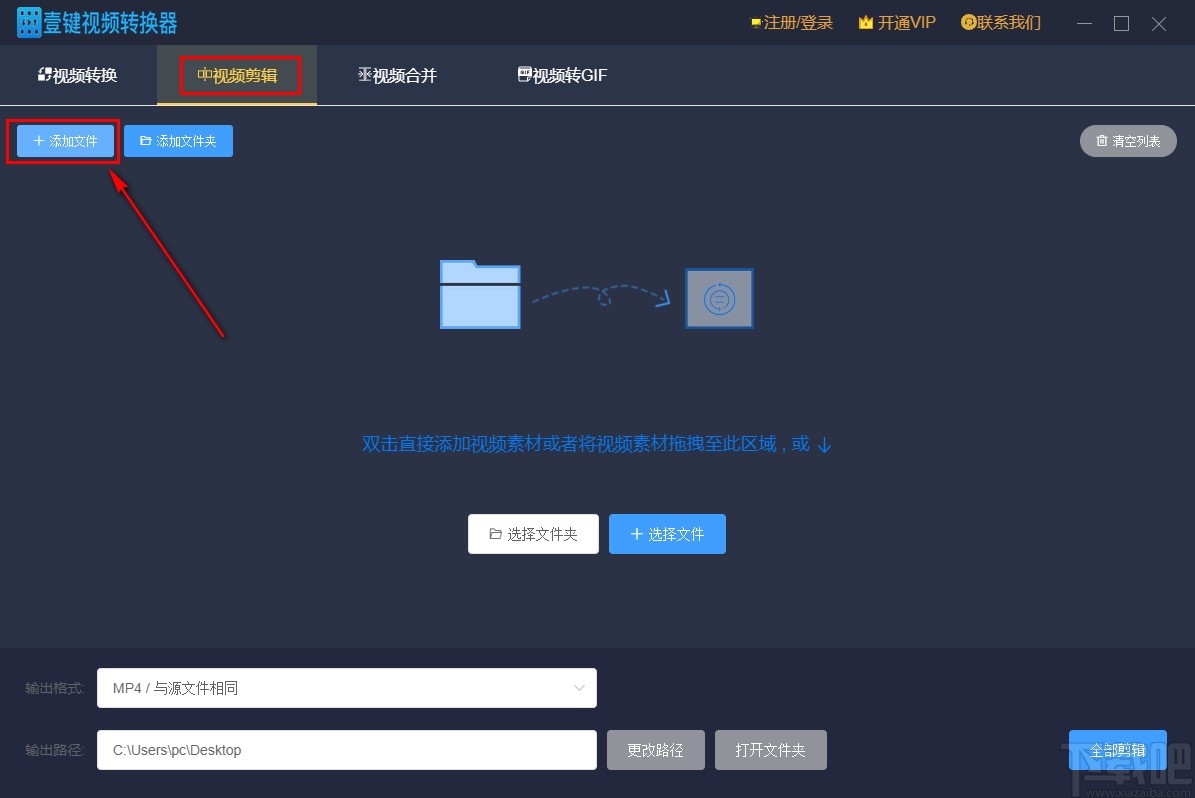 1.首先第一步我们打开软件之后在软件界面上方选择视频剪辑功能模块,选择之后点击添加文件按钮。