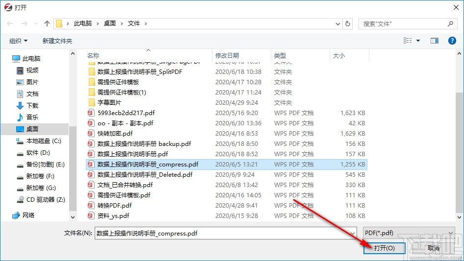 2.点击这个添加文件之后,下一步会打开一个选择文件的界面,我们需要在这个界面中选择想要分割的PDF文件,选择之后点击右下角的打开按钮。