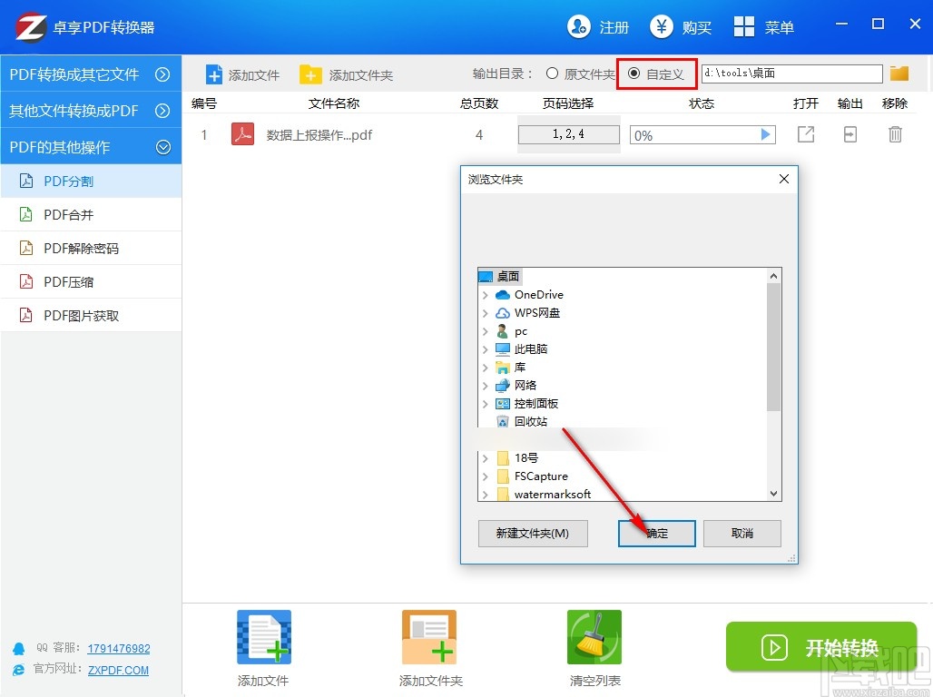 5.设置好页码之后,下一步我们在界面右上方选择自定义这个选项,选择自定义之后我们在出现的界面中选择输出目录之后点击下方的确定按钮。