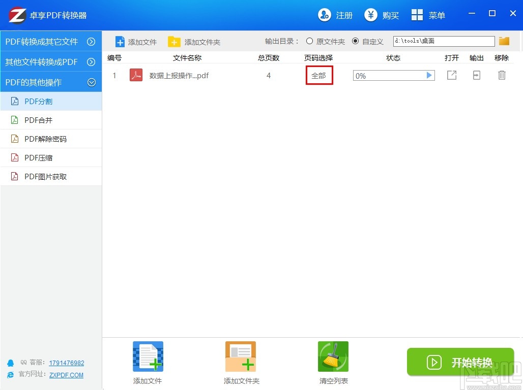 3.点击打开按钮将文件成功添加到软件界面之后,我们在界面中找到页码选择位置,点击它下面的全部按钮可以对分割的页码进行选择。