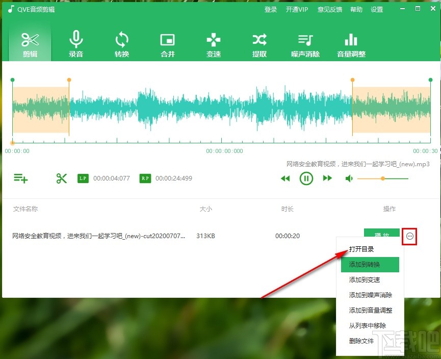 6.最后我们点击操作选项下方的三点图标,然后在出现的界面中可以看到一个打开目录的选项,我们点击打开目录即可查看剪切音频的输出保存目录。
