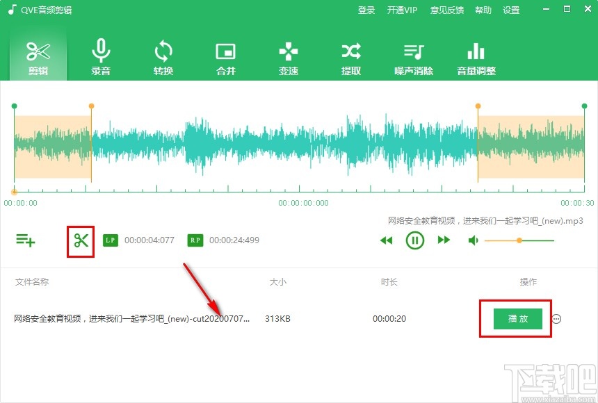 5.设置好音频的剪切开始时间和结束时间之后,我们点击界面中的剪刀图标即可将选取的片段剪切下来,会显示到下方的界面中,点击播放按钮可以播放剪切部分的音频。