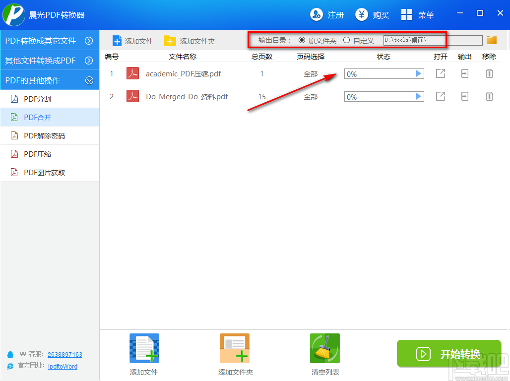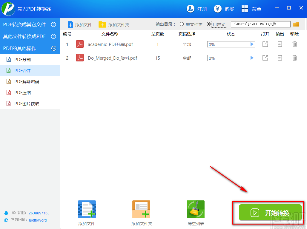 5.完成以上所有步骤后,我们在界面右下角找到“开始转换”按钮,点击该按钮就可以合并PDF文件并将其保存到指定的文件夹中。