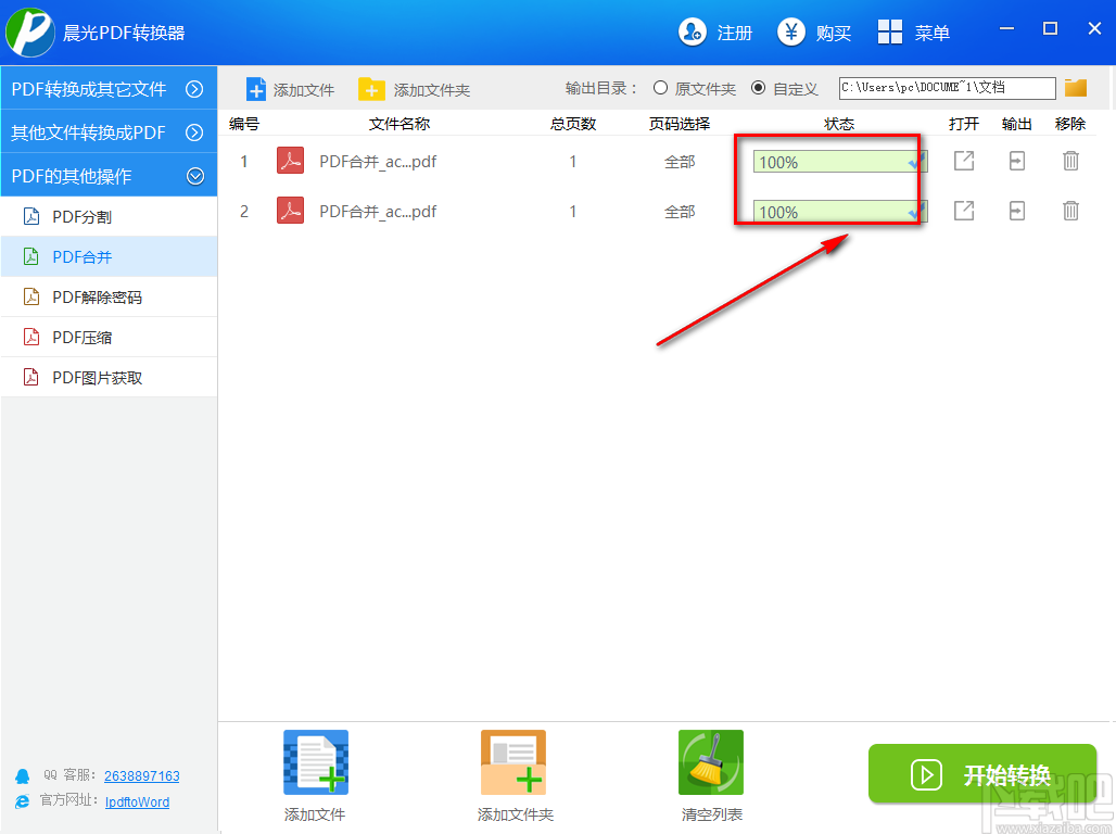 6.合并PDF文件的速度非常快,PDF合并完成后,我们可以在界面上的文件列表中查看到状态是100%。