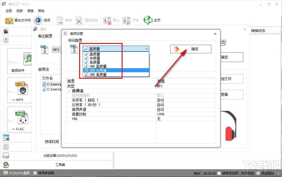 5.一般软件都是自动默认使用高质量的,如果用户需要对音频质量进行改变的话,点击下拉列表选择想要使用的质量,然后点击确定按钮即可。