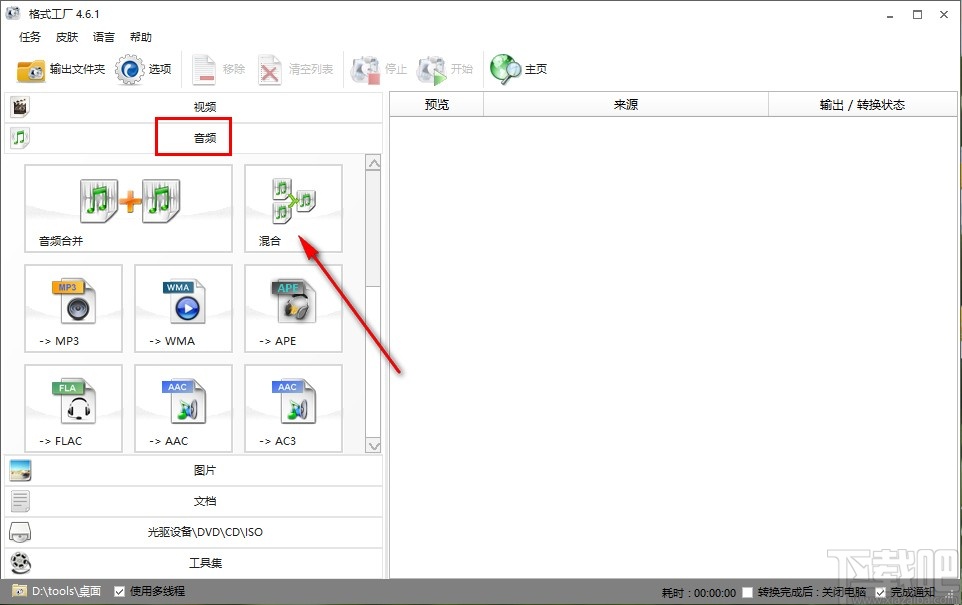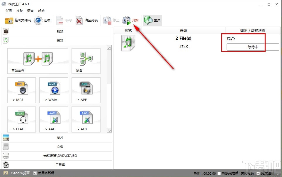 7.最后一步我们会回到软件的主界面,然后我们可以看到混合音频这个任务选项,点击界面上方的这个开始按钮就可以开始混合音频文件的操作了。