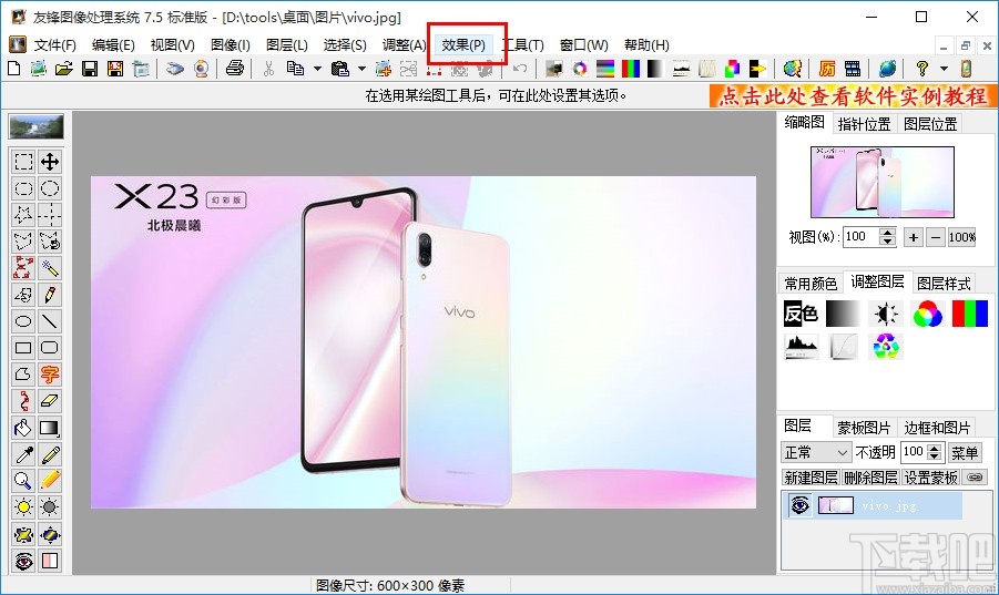 3.点击这个打开按钮之后,下一步我们在软件主界面上方的操作选项中,找到效果这个选项卡,找到之后点击它。