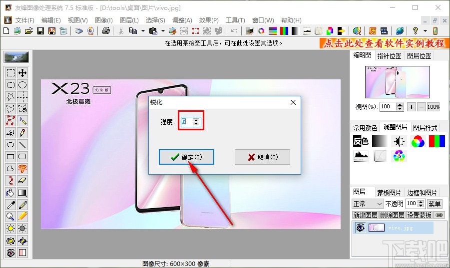 5.点击锐化选项之后就会出现一个锐化功能界面,我们根据自己的需要设置好锐化强度之后,点击界面中的确定按钮即可。
