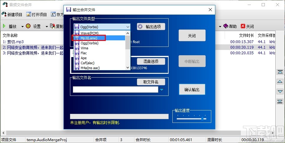 6.点击输出合并功能之后就会打开输出合并文件界面,选择输出合并文件的类型,选择与原音频文件相同的格式。