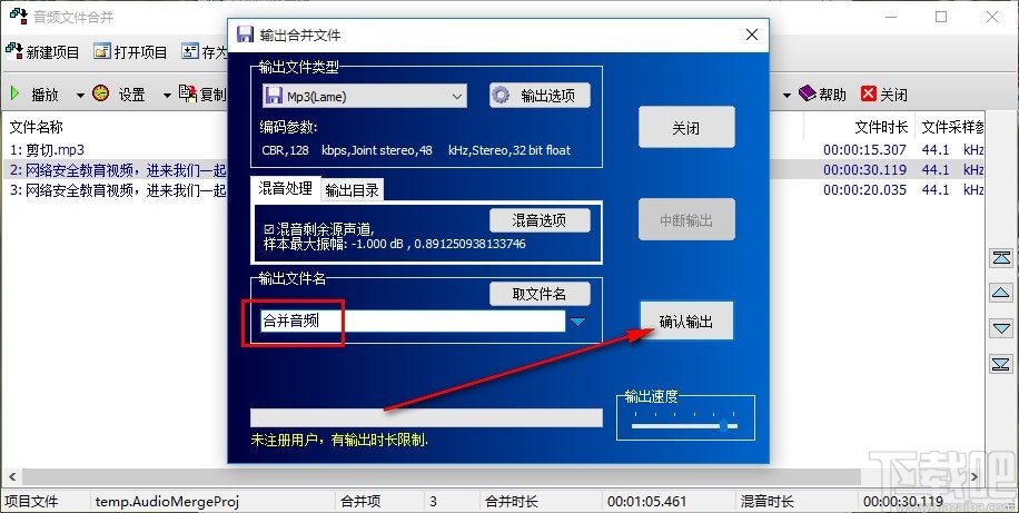 7.最后一步在输出文件名位置,设置好输出保存的文件名称之后点击右边的确认输出按钮就可以开始合并输出音频的操作了。