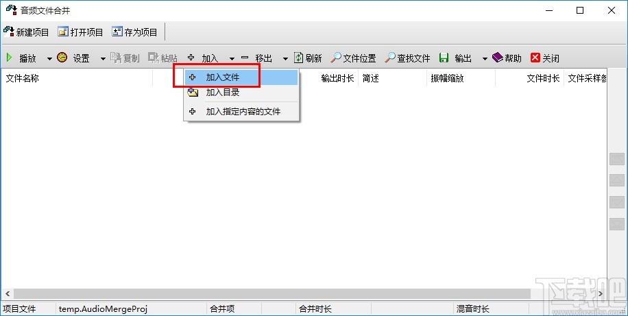 2.进入到音频文件合并功能界面之后,我们找到加入选项点击之后选择加入文件这个功能,准备添加要合并的音频文件。