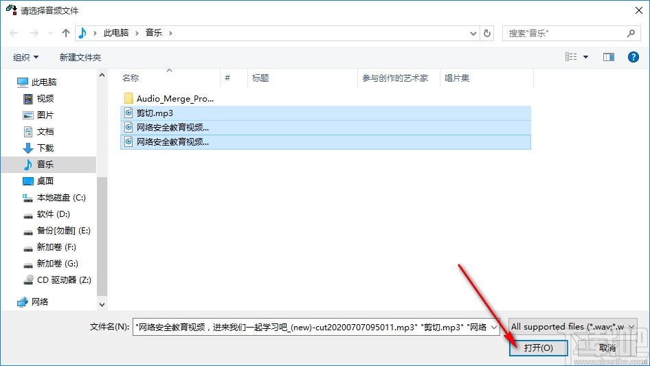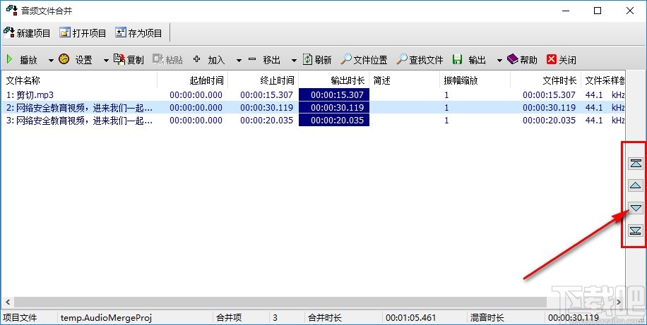 4.点击打开按钮成功将音频添加到软件界面之后,我们找到界面右边的上下箭头可以设置音频合并的顺序。