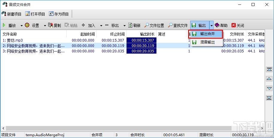 5.设置好音频合并顺序之后,我们找到界面上方的输出选项,点击之后选择输出合并这个功能。