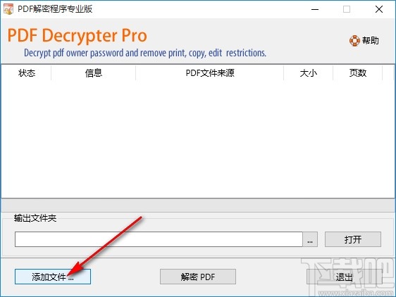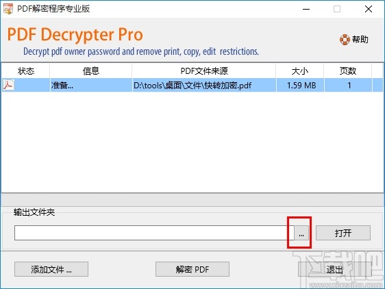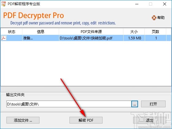 6.设置好输出文件夹之后,我们就可以点击界面下方的这个解密PDF文件按钮来开始解密PDF文件的操作了。