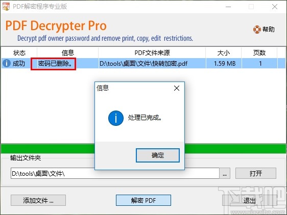 7.等到解密PDF文件的操作完成之后,我们在界面中可以看到处理完成的提示,并且会显示密码已删除,如下图中所示。